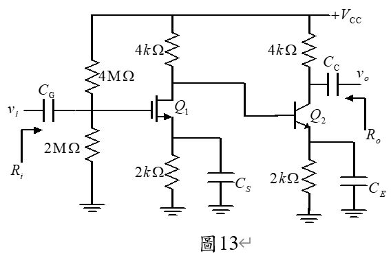 48.圖13所示電路為E-MOSFET共源極與BJT共射極串接的BIMOS放大電路,若,則輸入阻抗與輸出阻抗Ro約為多少? (A) (B) (C) (D)。