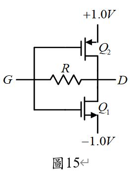 50.圖15電路之MOSFET互相匹配,兩電晶體之參數 、臨界電壓 。電阻R=1.2MΩ。若G與D開路,則汲極電流ID1應為多少? (A)2.25 (B)1.125 (C)0.25 (D)0.125mA 。