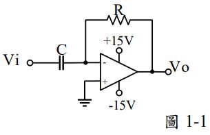 (A) 此為積分電路 (B) 若Vi 為方波,則 Vo 為三角波 (C) 若Vi 為弦波,則 Vo 的振幅與R 及C 值無關 (D) 若Vi 為弦波,則頻率越低 Vo 的振幅越小。