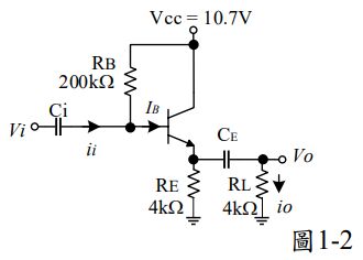 3. 圖 1-2 所示,若 BJT 工作於主動區,β = 99, VBE = 0.7 V,且基極交流電組 rπ=1kΩ, 則 io/ii 約為何?