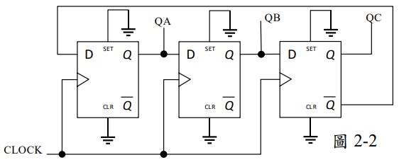 2. 如圖 2-2 所示電路,假設 D 型正反器 QA, QB, QC 之初始值為 000,CLOCK 為 3KHz,則 QC 的輸出頻率為? = ____________。