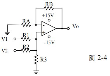 5. 如圖 2-4 所示電路,假設 R1=R2=R3,RB=2RA,Vo = _____________。