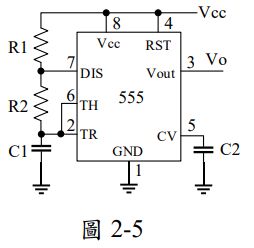 6. 如圖2-5所示電路,C1=10uF,請設計R1、R2使輸出為一100Hz、工作週期為66.6%的脈波。 R1=_______。