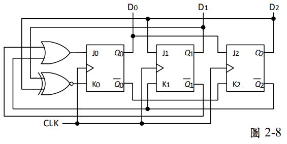 9. 如圖2-8電路圖中,若D2D1D0的初始狀態為111,且CLK適當觸發,電路經過 9個時脈週期 後,D2D1D0會呈現甚麼狀態? _________