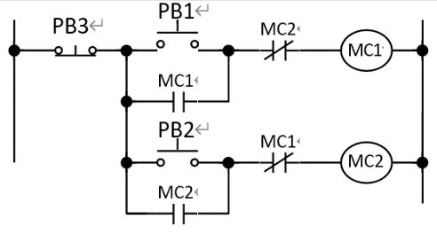 16. 如圖繼電器電路,當PB3未押下且MC1與MC2 OFF時,若依序押下啟動按鈕PB1與PB2時,則MC1與MC2均動作。