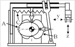 (A)夾爪的運動路徑為 L 字型 (B)水平方向 y 是以凸輪 A 驅動 (C)垂直方向 z 是以凸輪 B 驅動 (D)彈簧 C 係使從動件確保接觸凸輪 A。
