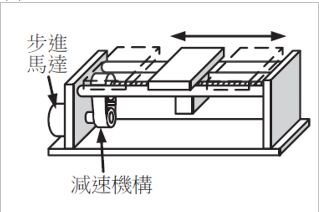 20. 如圖所示 有一步進馬達驅動一組定位工作平台 此步進馬達之全步進角度為(θ) 馬達輸出軸配有一減速比(i)之減速齒輪組,齒輪組之輸出軸接至導螺桿。若導螺桿每轉動 10 圈 滑台移動 50mm 下列敘逑何者正確?