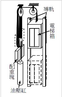 22. 如圖所示,為某高鐵車站一部乘客使用之油壓電梯的機械結構圖,其電梯箱重量W=500kgf、移動距離 S=12m、移動時間 t=10sec、承載乘客的重量 W2=1625kgf;若忽略機械摩擦因素,有關配重塊(平衡電梯箱用)之敘述,下列何者錯誤?