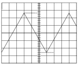 46. 某一量測信號如下圖所示,電壓範圍選擇鈕為 0.5 v/div,時間範圍選擇鈕為 5 us/div, 示波器探棒設於 x10 位置,該波形之週期 T 與振幅 Vm 為何? (A)T=60us, Vm=13V (B) T=30us, Vm=26V (C)T=60us, Vm=26V (D) T=30us, Vm=13V。