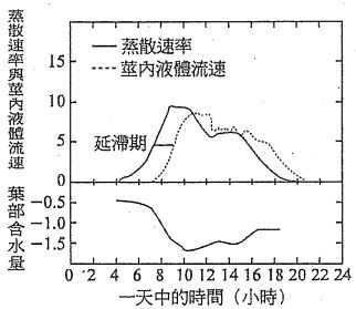 1.勝利欲探究植物物質的運輸,將某植物在一天中蒸散速率、莖內液體流速與葉 內含水量的關係,繪製如附圖:圖中「蒸散速率」與「莖內液體流速」兩曲線 之間的時間差稱為「延滯期」根據圖中資料判斷,下列敘何者正確?