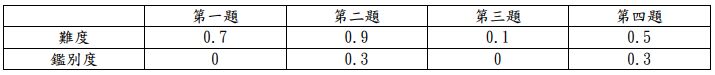 31. 以下四個題目是一班50 位學生測驗之後所得到的難度及鑑別度之資料,請判斷哪一試題較佳?(A)第一題(B)第二題(C)第三題(D)第四題