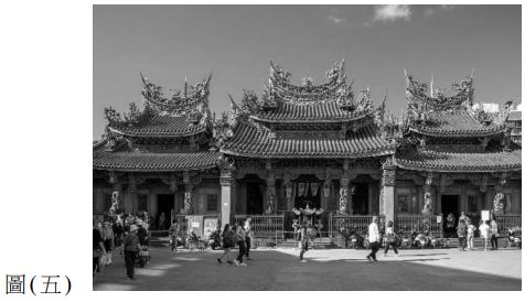 32. 阿瑞老師帶同學來到圖 ( 五 ) 的臺灣傳統廟宇文化探訪,在此廟宇裡無論石柱、浮雕與銅像皆有不少中西方融和之處,被譽為「東方藝術殿堂」,是由藝術家李梅樹先生所親自監督構建廟宇為何? (A) 臺北市萬華龍山寺 (B) 新北市三峽祖師廟 (C) 雲林縣北港朝天宮 (D) 臺南市大天后宮