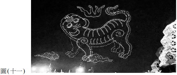 44. 2022年臺灣燈會中,無人機在天空排列出了圖(十一)老虎圖騰,這個圖騰作品目前典藏於臺博館,請問這個老虎圖騰意象是源自於何處? (A) 清朝時期高雄三鳳宮虎爺祭祀意象 (B) 1935年國軍特殊戰功使用的文虎榮譽旗 (C) 1895年乙未戰役時期臺灣民主國使用的藍地黃虎旗 (D) 雲林縣北港鎮哨角藝陣「震威團」的飛虎繡旗