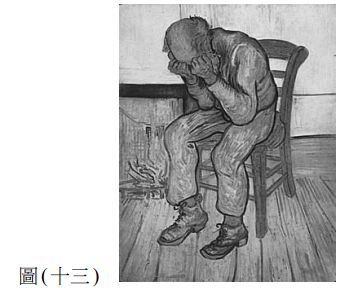48. 圖 ( 十三 ) 為文森․梵谷 ( Vincent Van Gogh ) 的作品《在永恆之門》,此幅可探討藝術對 人類身心影響的作品,除了是畫家心境的描述,也探討自身內心與社會之間的衝突, 此一畫作的創作背景為何? (A) 文森․梵谷(Vincent Van Gogh )描畫自己親生弟弟的畫作 (B) 此作品對於文森․梵谷 ( Vincent Van Gogh ) 自我內心產生很大的治療,藉由此作品 也讓他開始創作星空等作品 (C) 為文森․梵谷(Vincent Van Gogh )在聖雷米精神病院所創作 (D) 此作品為文森․梵谷 ( Vincent Van Gogh ) 創作鉛筆稿,後來由高更 ( Paul Gauguin ) 完成作品