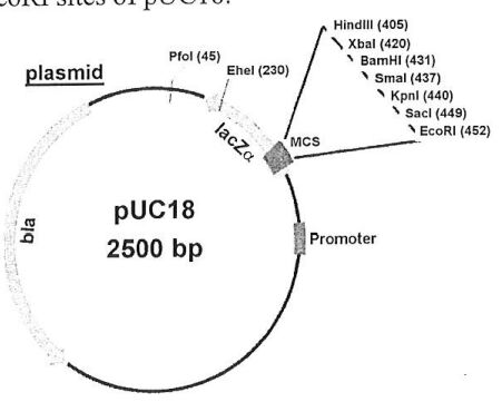 3. Below are shown schematics of a 1,500bp PCR product and the pUC18 plasmid, with important restriction sites and their position in parentheses. You clone the PCR product between BamHI and EcoRI sites of pUC18.