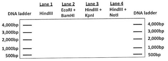 For each lane of the agarose gel below, show the bands that will result from digesting your plasmid (pUC18 with your PCR product inserted between BamHI and EcoRI sites) with the indicated restriction enzymes. On the left and right sides of the gel are DNA ladders to serve as comparison. As shown above, the insert PCR product is 1,500bp, and pUC18 plasmid is 2,500bp.