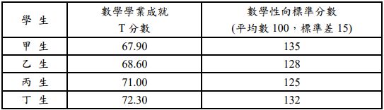 17 下列哪些學生的測驗成績符合我國現行身心障礙及資賦優異學生鑑定辦法中,學術性向資賦優異學生的鑑定基準? (A)甲乙丙 (B)甲乙丁 (C)甲丙丁 (D)乙丙丁