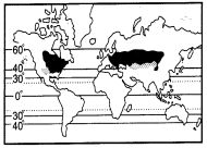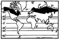 4. 表(一)為某地的長期觀察平均氣候資料。請問該種氣候的分布圖應為何? (A) (B) (C) (D)