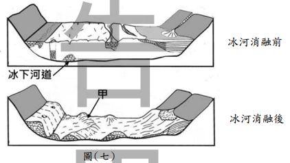 6. 圖(七)為 U 型谷的橫剖面,請問甲是哪種地形? (A)端磧 (B)鼓丘 (C)蛇丘 (D)羊背石。
