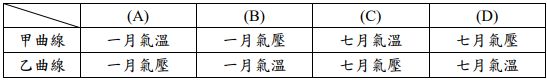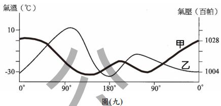 8. 圖(九)的橫坐標為經度,甲、乙兩條曲線為沿著北緯 60 度,不同經度的平均氣溫或氣 壓變化,請問這兩條曲線分別代表的意義,最可能為何? (A) (B) (C) (D)