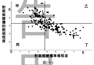 9. 圖(十)是全球各國對氣候變遷的脆弱程度與準備程度關係圖。準備程度越高對氣候變 遷的適應力越強,脆弱程度越高則對氣候變遷的適應力越弱,圖中每一個黑點代表一 個國家,依據準備與脆弱程度的不同,可分成甲到丁四種類型。請問歐美已開發國家 大多屬於哪種類型?