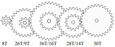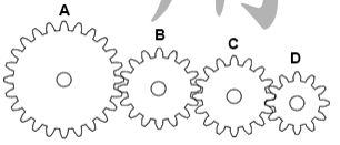 35. 如下圖,A、B、C、D各輪的齒數分別為24T,16T,16T,12T,若A輪轉速為200rpm, 則D輪轉速?(轉向相同以+表示,轉向相反以-表示) (A)+320 rpm (B)-320rpm (C)+400rpm (D)-400rpm。
