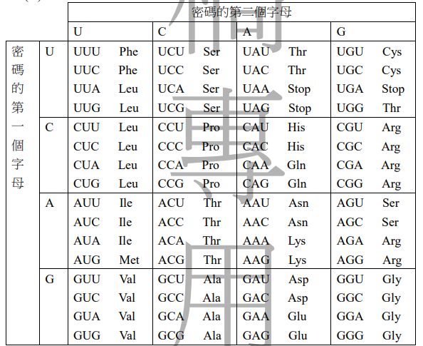 8. 承上題,若該序列發生突變:由 3’向右計數第 16 個鹼基右側插入一個鹼基 T,則以突變後的序列為指令產生的肽類,共有幾種胺基酸?(請參考下表作答) (A) 6 (B) 7 (C) 8 (D) 9