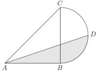 48. 如下圖, △ABC 為等腰直角三角形, ∠B 是直角; 是半圓的直徑, D 為半圓周的中點。已知 ,則陰影部分的面積最接近下列哪個選項的值? (A) 8 (B) 10 (C) 12 (D) 14
