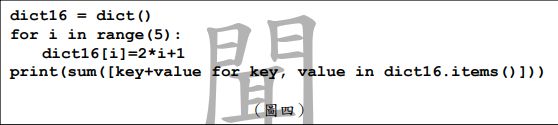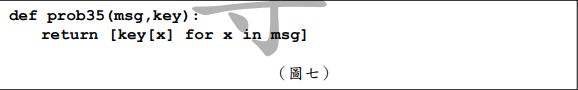 35. 假定發信者以圖七中的 Python 程式為訊息 msg 加密,發信者選擇自己的 key,將 prob35(msg,key)傳送給收訊人。再假定收訊人也使圖七的程式來解密。如果 發信者傳送訊息[‘b’, ‘a’, ‘b’, ‘c’]使的 key 是[‘a’: ‘b’, ‘b’: ‘c’, ‘c’: ‘a’]的話,收訊人要以下哪一個 key,才能透過 prob35(msg,key)得知收訊人所發送的原本訊息?