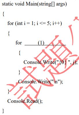 39.請問下面程式碼中的(1)應該如何填寫才能有圖一的結果 (A) int j = 1; j <= i; j++ (B) int j = 5; j <= i; j++ (C) int j = 1; j <= 5; j-- (D) int j = 5; j >= i; j++