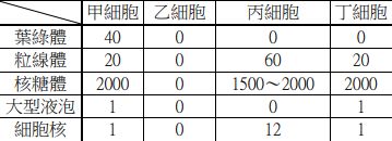 1. 某生以光學顯微鏡觀察四種不同細胞內各種構造,並記錄其數目如附表。請問該生所記錄的各項數據,何者為偽數據(最不符合常理)?
