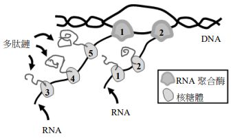 3. 附圖為某生物進行基因表現過程的示意圖 ,關於圖中所示之基因表現過程,下列敘述何者正確?(A)造成肺結核的結核桿菌,其基因表現符合右圖(B)RNA聚合酶的移動方向是往圖的右側移動(C)核糖體是往圖的右上方方向移動(D)相較於RNA聚合酶1,RNA聚合酶2較早進行轉錄作用(E)相較於核糖體5,核糖體3更靠近該mRNA的3’端。