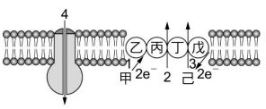 5. 附圖為某種生物膜所進行的反應,下列何處可進行如附圖的反應? (A)葉綠體類囊體 (B)葉綠體外膜 (C)葉綠體基質 (D)粒線體外膜 (E)粒線體內膜