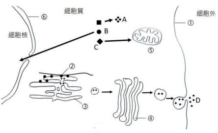 6. 右圖為某動物胰臟細胞內蛋白質的合成與轉運 過程示意圖。圖中①②③④⑤⑥代表細胞結構 ,A、B、C、D分別代表不同的蛋白質。請根 據圖判斷下列敘述何者正確? (A)①~⑥中,只有 ② 不含磷脂分子 (B)A、B、C、D中,A最可能為組成核糖體的蛋 白質 (C)A、B、C、D中,C最有可能為 ATP合成酶 的蛋白質 (D)蛋白質D的合成與轉運過程為②→③→④ (E)胰液中的胰雙糖酶可在④儲存、修飾。