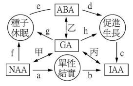 (A) a、b、h 為促進作用 (B) a、d、f、g 為抑制作用 (C)作用不正確的(無此作用的)為 a、f (D)相互拮抗的為甲、乙、丙 (E)圖中四激素皆為天然的激素