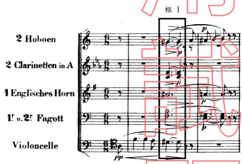 37. 請根據下方譜例,有關框 1 的和弦敘述,何者錯誤?(A)稱為崔斯坦和弦(Tristan chord),懸而不決的和聲,為無調性的音樂展開無限想像 (B)可以分析為半減七和弦 (C)是由 F 音、B 音、升 D 音、升 G 音四個音組成的和弦 (D)此和弦的重要性逐漸被人認識,被德布西、史特拉文斯基等諸多作曲家引用