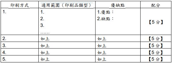第一題: 試述印刷五種主要方式、適用範圍(印刷品類型-例舉各五項)及優缺點。(請以表格方式陳述分析比較)