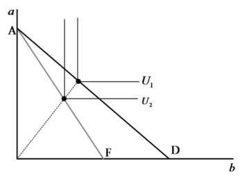 5 圖中 a 和 b 為財貨,U1 和 U2 為消費者的效用水準,兩財貨的市場皆為完 全競爭,AD 為財貨 b 被課稅前消費者的預算線,AF 為稅後預算線,假設 租稅全由消費者負擔。下列敘述何者正確? (A)因為課稅後邊際替代率的絕對值為 ,不等於邊際轉換率的絕 對值,故有超額負擔 (B)因為對財貨 b 課稅只有替代效果,故有超額負擔 (C)因為對財貨 b 課稅只有所得效果,故無超額負擔 (D)政府取得的稅收為 FD