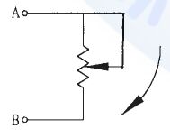 35. 下圖順時鐘(向下)調整可變電阻 A、B 之間的電阻值(A)不變(B)先小後大(C)愈來愈小(D)愈來愈大。