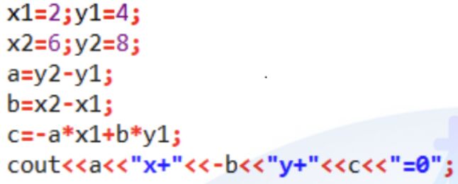 67. 對於下列 C/C++程式片段,何者敘述有誤?(A)若(x1,x2)及(y1,y2)視為兩個二維平面座標,程式功能為計算直線方程式(B)若(x1,x2),(y1,y2)及(5,4)視為三個二維平面座標,則會構成一個直角三角形(C)程式輸出為 4x+-3y+8=0(D)若(x1,x2)及(y1,y2)視為兩個二維平面座標,則直線方程式的斜率為。