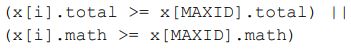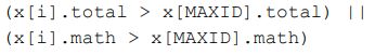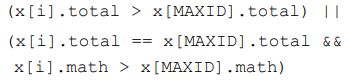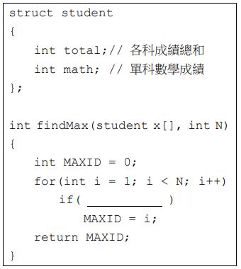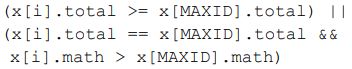 29. 右側程式碼的功用是對於所有學生,找出成績總和最高者,若總和相同時,則比較數學成績。請問 ( ________________ ) 應填入下列何者? (A) (B) (C) (D)