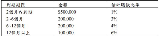 48. 甲公司以帳齡分析法估計壞帳費用,年底的應收帳款總額為$1,000,000,備抵壞帳有借方餘額$2,000,該公司以下列比率估計壞帳費用:請問該公司的壞帳費用應為多少? (A)$27,000 (B)$25,000 (C)$23,000 (D)$21,000