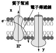 5. 光合作用及呼吸作用的過程均有電子經過電子傳遞鏈及質子穿越生物膜的現象,如圖所示。下列相關敘述 何者正確? (A) x 處為葉綠體或粒線體的基質 (B)在葉綠體,電子經過電子傳遞鏈後,由 NADP+ 接收 (C)在粒線體,電子經過電子傳遞鏈後,由 NAD+ 接收 (D)在 y 處發生 ATP 水解:ATP+H2O→ADP+Pi+能量。