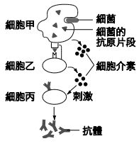 17. 哺乳類的免疫系統為許多不同功能的免疫細胞共同合作,以抵抗入侵者的攻擊,根據附圖,選出以下正確的敘述。 (A)細胞甲為抗原呈現細胞,能夠將入侵的細菌分解成小段,展示於自己的細胞膜上,啟動非專一性的 防禦作用 (B)細胞乙為 TH,能夠接受抗原呈現細胞的刺激, 接著啟動體液免疫與細胞免疫 (C)細胞甲、乙、丙皆能產生記憶型細胞,為專一性免疫的記憶性功能 (D)細胞丙為 TC,能夠分泌抗體,殺死入侵的外來病原體。