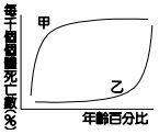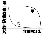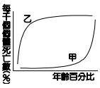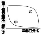 22. 現有兩種生物,甲生物產生子代數目少、具有育幼行為,乙生物產生子代或卵數目多,且幼年期存活率低。若將存活曲線圖之縱軸改成死亡的個體數,則甲、 乙的曲線分別為下列何者?(A)(B)(C)(D)