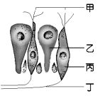 23. 下圖為嗅黏膜的示意圖,下列相關的敘述,何者正確? (A)甲為第一對嗅神經 (B)乙為皮膜細胞、丙為神經元 (C)丁先將神經訊息傳往視丘,再到大腦顳葉 (D)嗅覺發生的神經訊息傳遞途徑為:甲→乙→丙→丁。