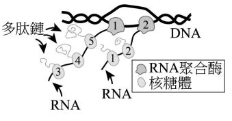 37 . 關於右圖所示之基因表現過程, 下列敘述哪些正確? (A)圖中應可複製出2條序列互補的 DNA(B)相較於RNA聚合酶1,RNA聚合酶2較早進行轉錄作用(C)核糖體是往圖的下方方向移動 (D)相較於核糖體3,核糖體 5 更靠近該mRNA的3'端(E)圖中應可轉譯出5條序列相同的的多肽鏈 。