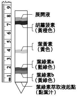 39. 有關光合色素色層分析的裝置及其相關敘述哪些正確? (A)以長條濾紙當作移動相 (B)以丙酮萃取菠菜光合色素 (C)以石油醚及 90%丙酮比例為 1:9 的展開液將 4 種光合色素分離 (D)色層分析的原理為根據混合色素中不同色素對 固定相的附著力和對流動相的溶解度而分離開來 (E)葉黃素的 Rf值 = 35/71。