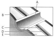 44.下圖為兩植物細胞之間溝通管道的示意圖,下列相關敘述何者錯誤? (A)A是木質部導管的壁孔 (B)A可以是伴細胞與篩管之間的溝通管道 (C)C為中膠層 (D)E為初生細胞壁 (E)若此植物感染病毒,增生的病毒可由A擴散至鄰近細胞