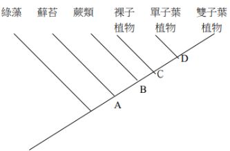 50.下圖為植物的演化關係圖,下列特徵中有 哪些是在 B – C 之間演化形成? (A)維管束 (B)雙重授精 (C)花粉管 (D)果實 (E)種子